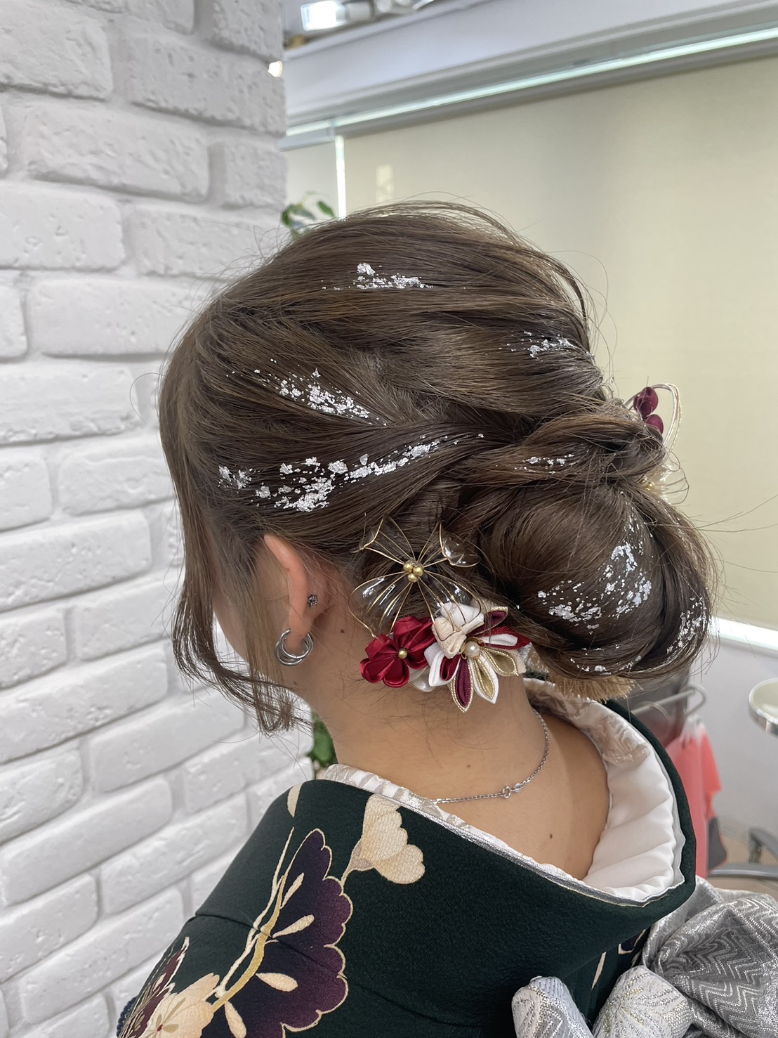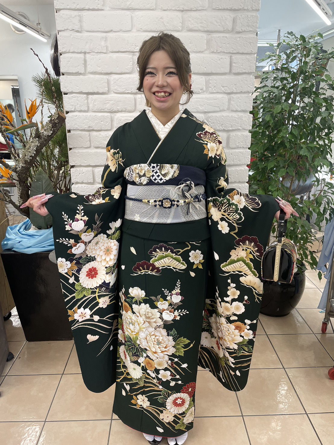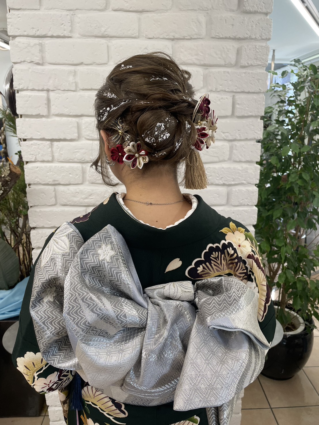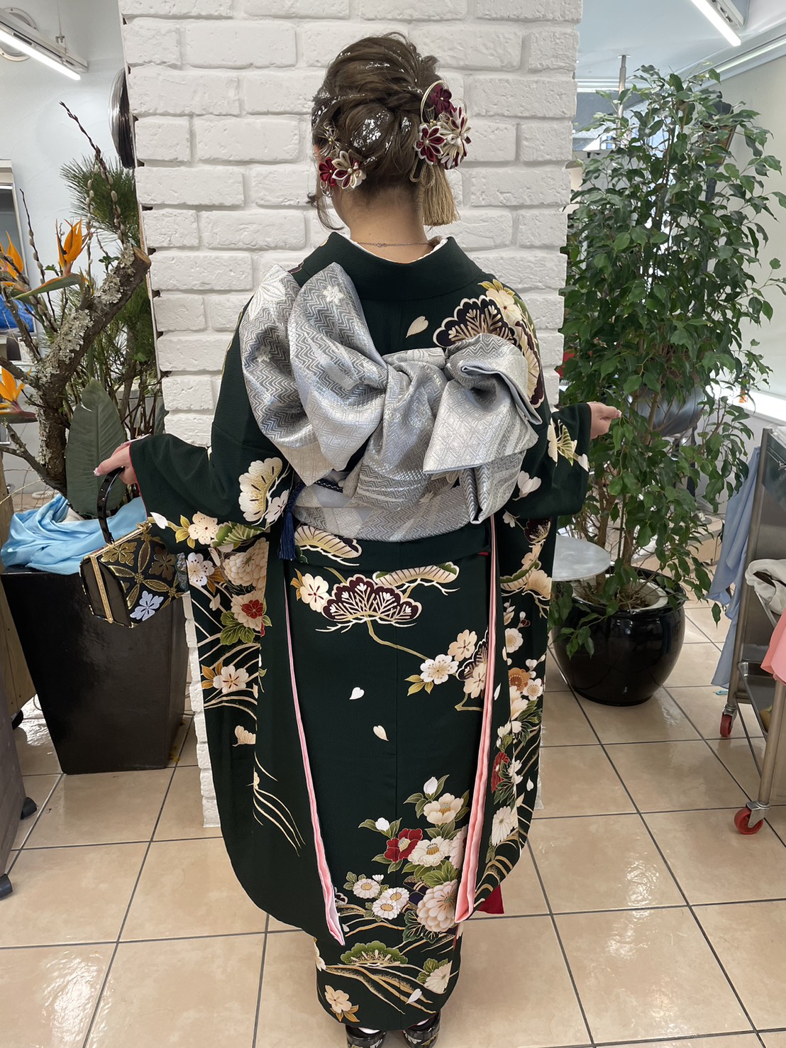 2026.02.05 Staff Blog 2026 成人式 亀有 ② 明るい髪色に銀粉を散らしお花の飾りでセット。シルバーの帯に濃緑の着物がお似合いです。 ヘアー担当 宗村 #SHAPE GARDENシェイプガーデン#ドライカット#イルミナカラー#ベル・ジュバンス#ヘッドスパ#口コミ#ヘナ#コタ#着付け#成人式#卒業式ヘア#髪質改善#ホリスティックヘアカット#ハイライトを活かしたボブ#強髪#くせ毛#悩み#コタクチュール#七五三