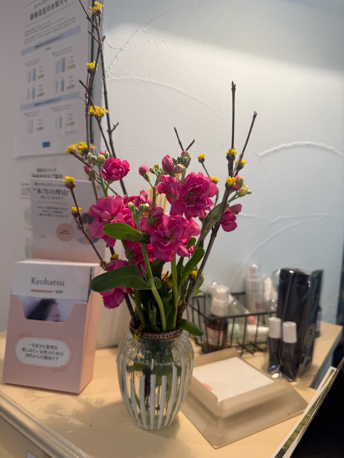 2026.02.22 Staff Blog 今週のお花 今週のお花 サンシューとストックです♪ ストックは種類別色別で春っぽく。 本来、サンシューの枝を曲げて躍動感を出したかったのですが、私にはなんちゃってで無理でした〜 #SHAPE GARDENシェイプガーデン#ドライカット#イルミナカラー#ベル・ジュバンス#ヘッドスパ#口コミ#ヘナ#コタ#着付け#成人式#卒業式ヘア#髪質改善#ホリスティックヘアカット#ハイライトを活かしたボブ#強髪#くせ毛#悩み#コタクチュール#七五三